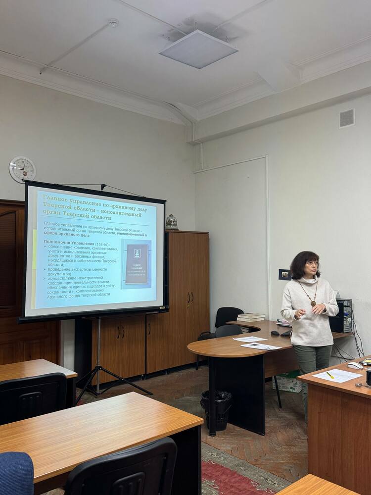 Так, Тамара Альбертовна Бархатова (консультант Главного управления по архивному делу Тверской области) представила студентам структуру Главного управления, ознакомила с особенностями прохождения государственной гражданской службы и некоторыми ограничениями, которые она накладывает. Тамара Альбертовна подробно рассказала, в чем состоит работа как самого Главного управления, так и его подведомственных организаций. Также было отмечено, что архив Тверской области на данный момент насчитывает более пяти миллионов архивных дел, что сопряжено с интенсивной и беспрерывной работой его сотрудников.