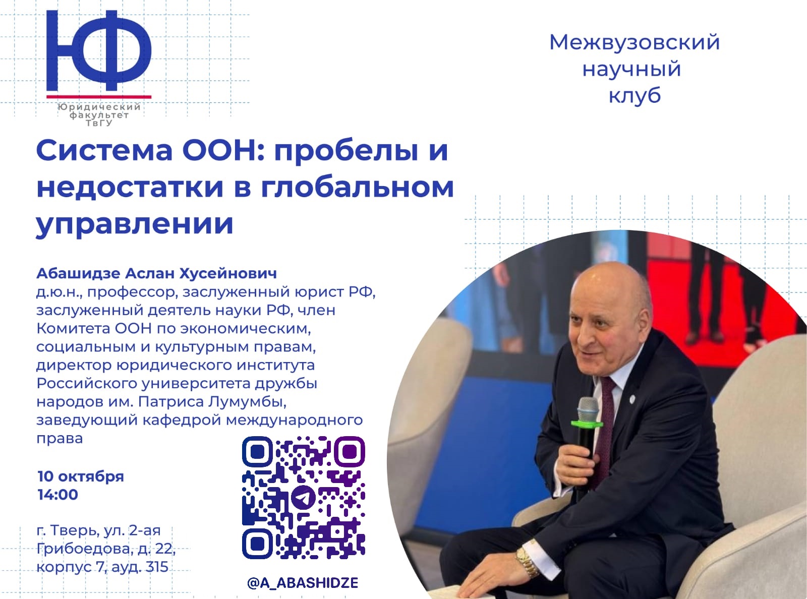Первой в этом учебном году будет проведена публичная лекция д.ю.н., профессора, заслуженного юриста РФ, заслуженного деятеля науки РФ, члена Комитета ООН по экономическим, социальным и культурным правам, директора юридического института Российского университета дружбы народов им. Патриса Лумумбы, заведующего кафедрой международного права Абашидзе Аслана Хусейновича.