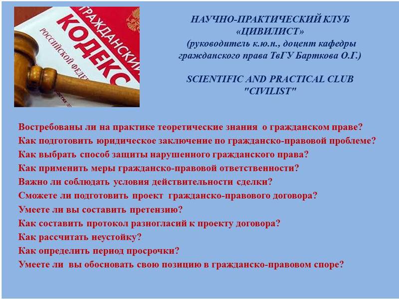 С 2021 года на юридическом факультете Тверского государственного университета возобновляет свою работу научный кружок под руководством кафедры гражданского права (заведующий кафедрой – проф. О.Ю. Ильина). Теперь он меняет формат и предлагает практические направления в использовании теоретических знаний учебной дисциплины «Гражданское право России». Это научно-практический клуб «ЦИВИЛИСТ» (НПК «ЦИВИЛИСТ»).